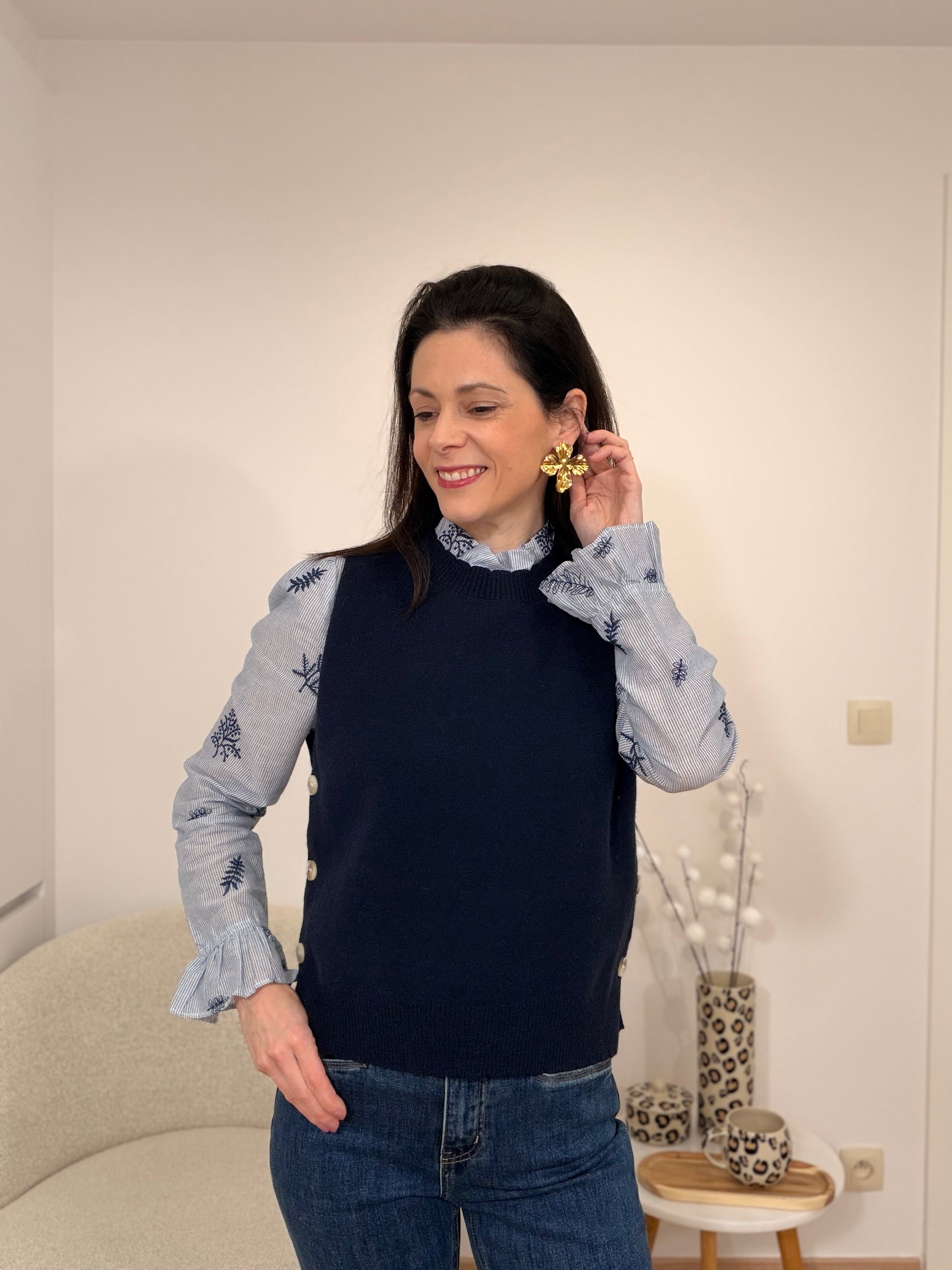 Ontdek deze mouwloze trui in marineblauw, een veelzijdig kledingstuk dat perfect aansluit bij al je stijlwensen. Ideaal om te combineren met andere kledingstukken, en geeft je garderobe een chique en tijdloze uitstraling.