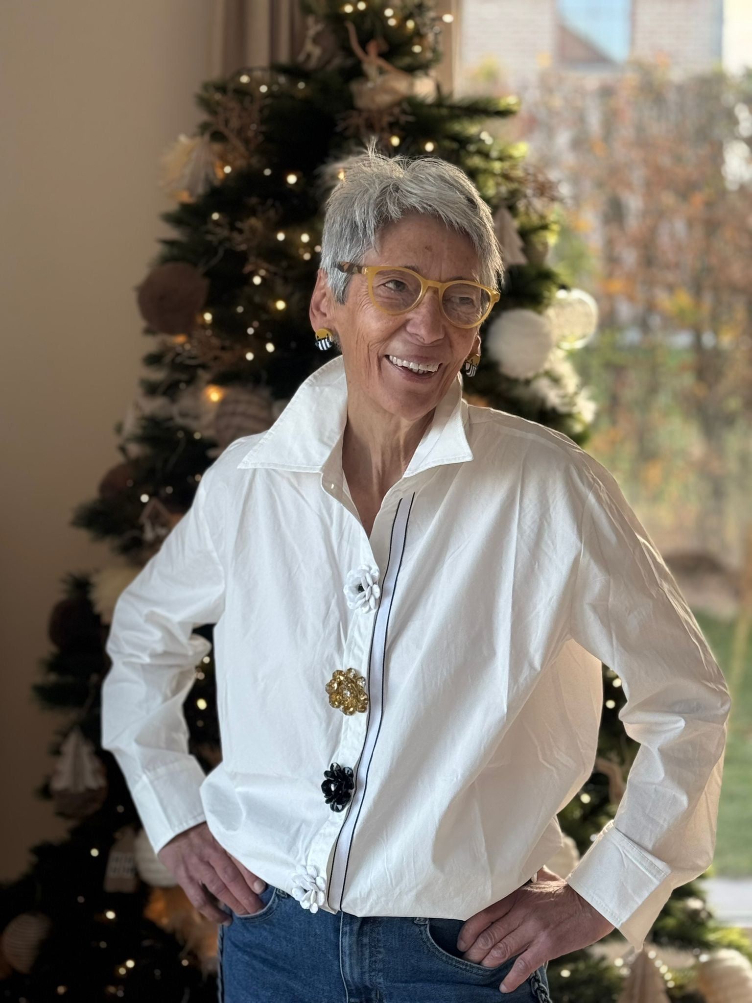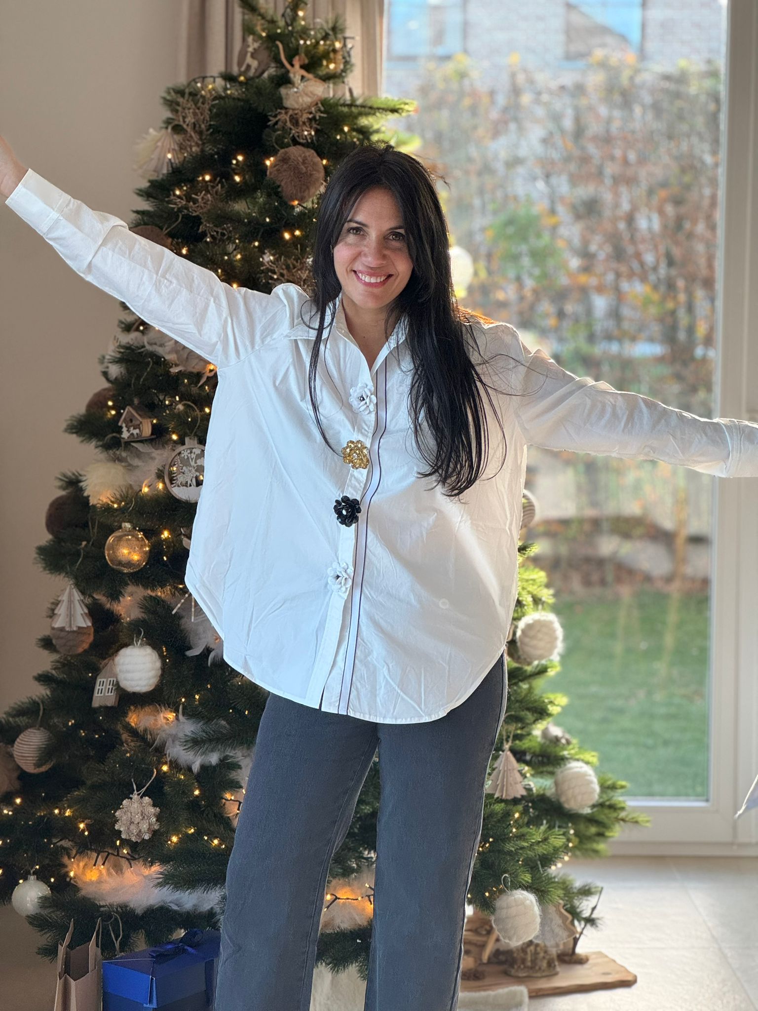 Chemise blanche élégante avec boutons floraux distinctifs.