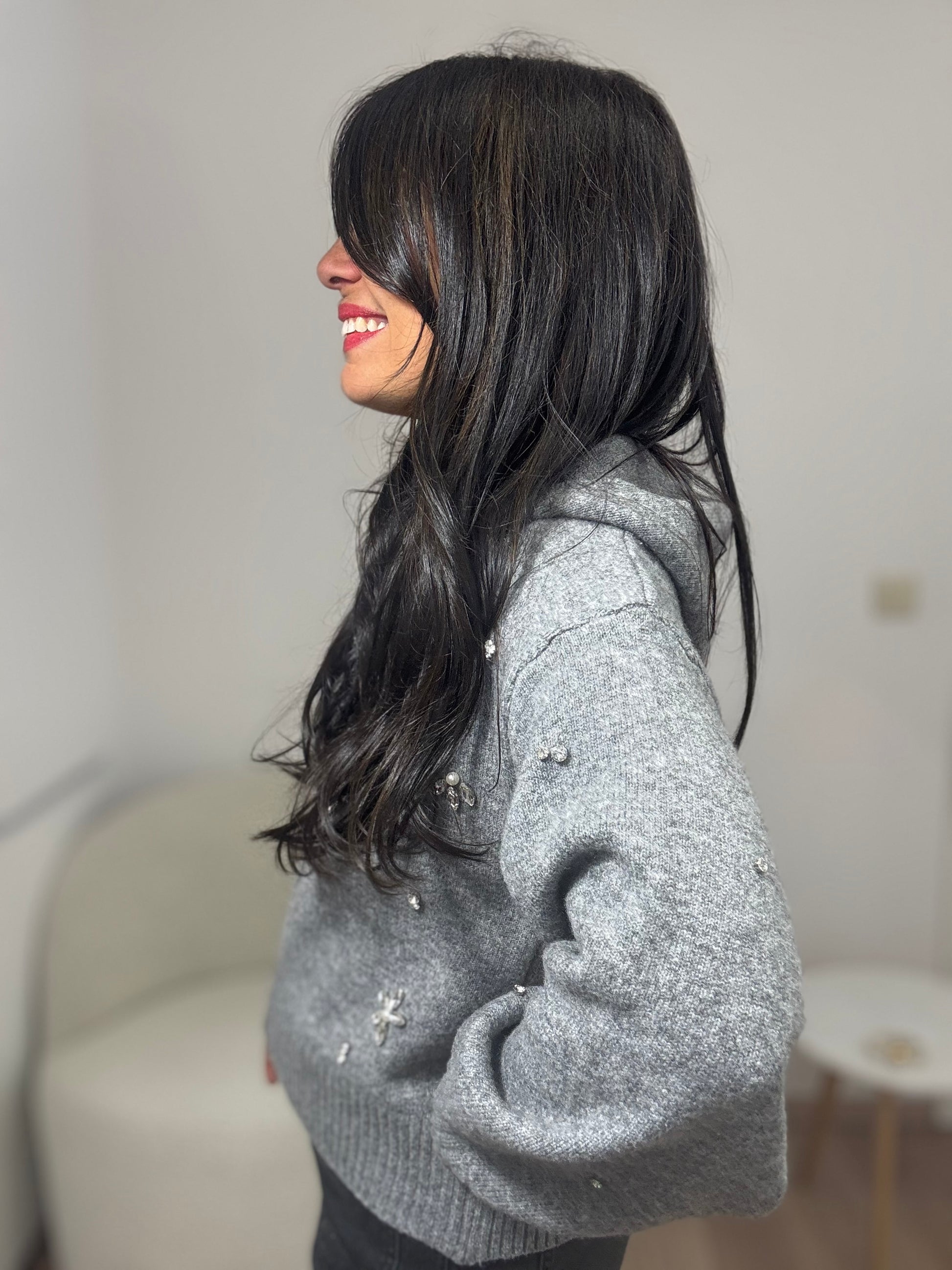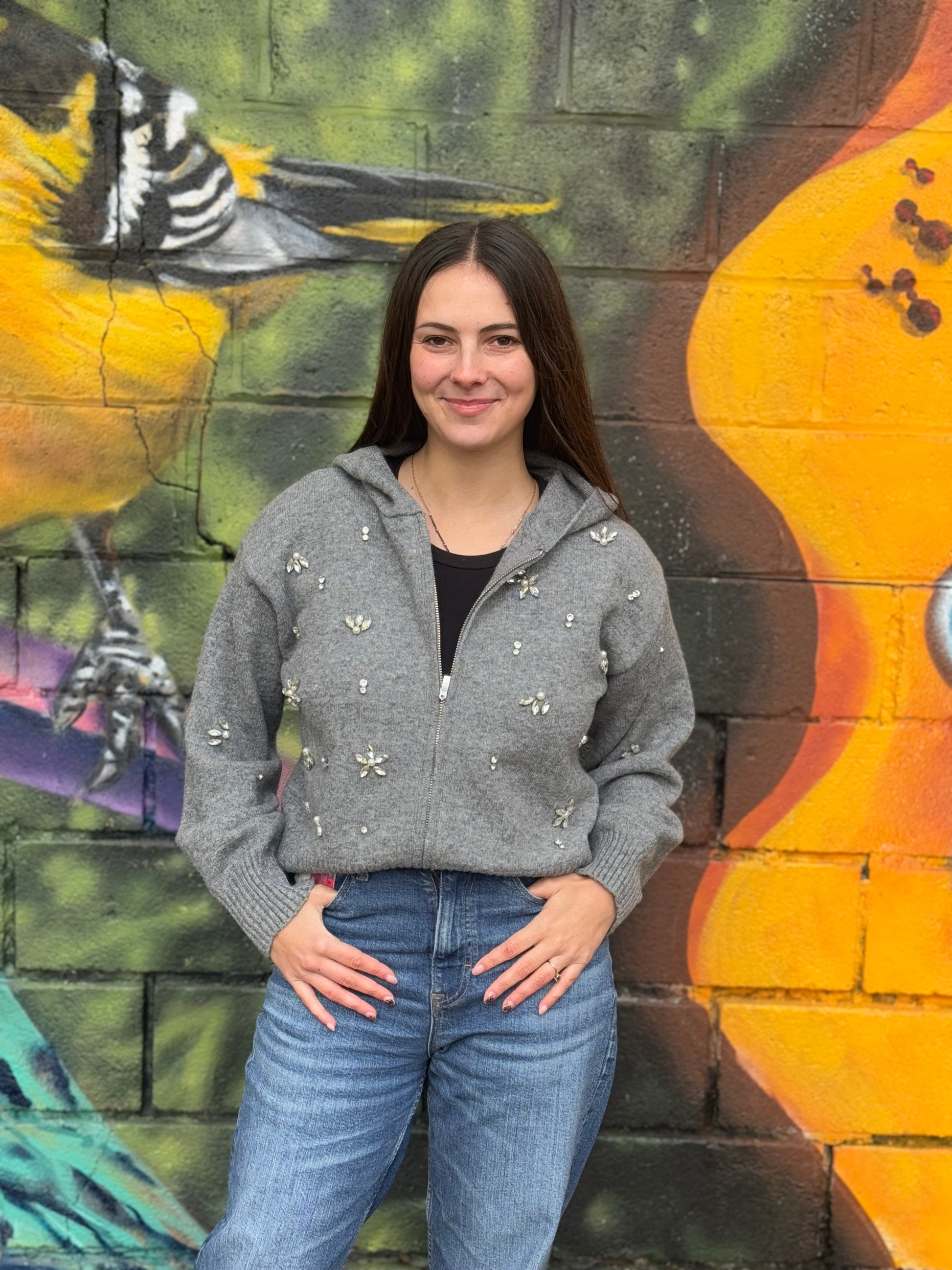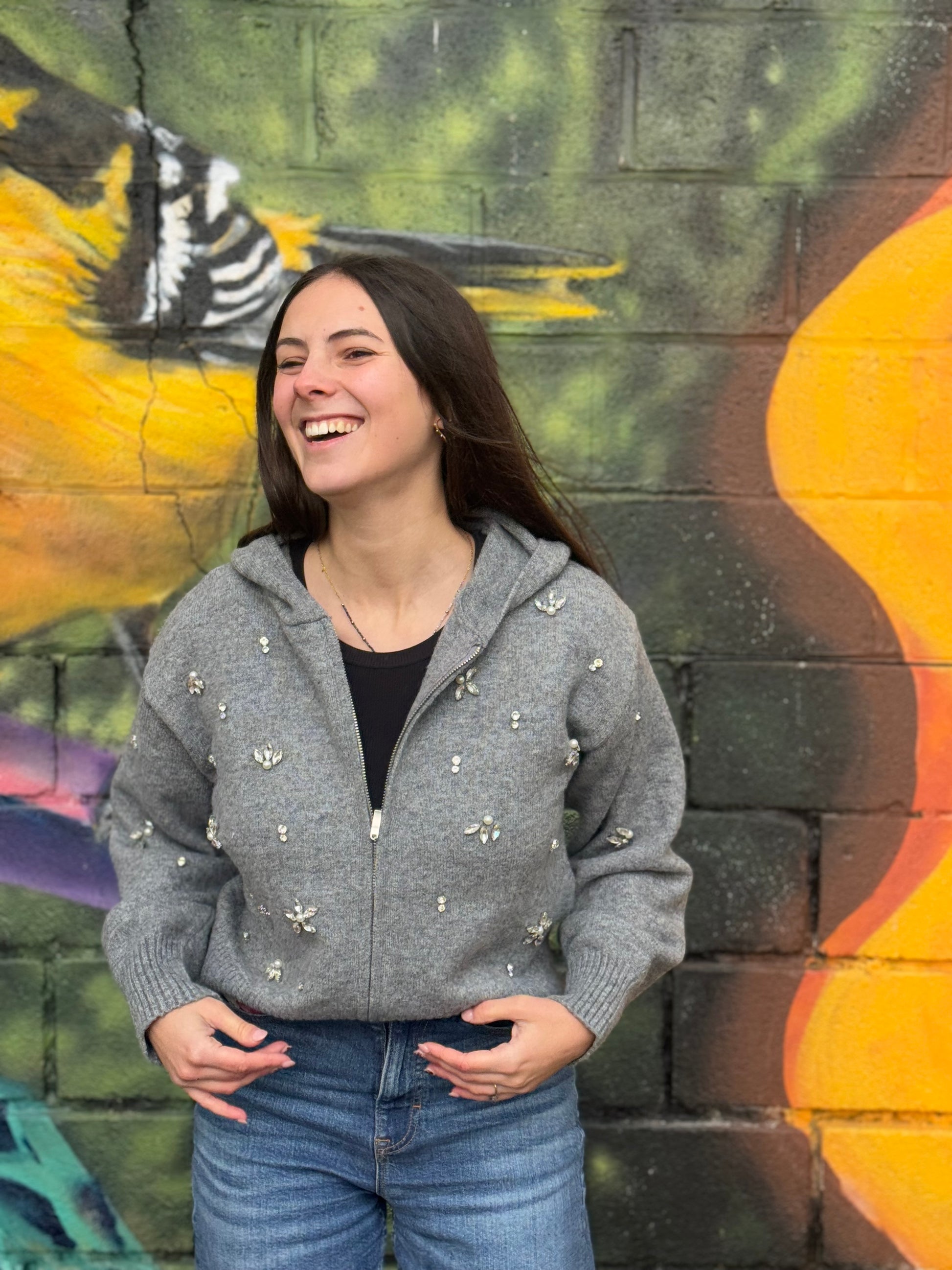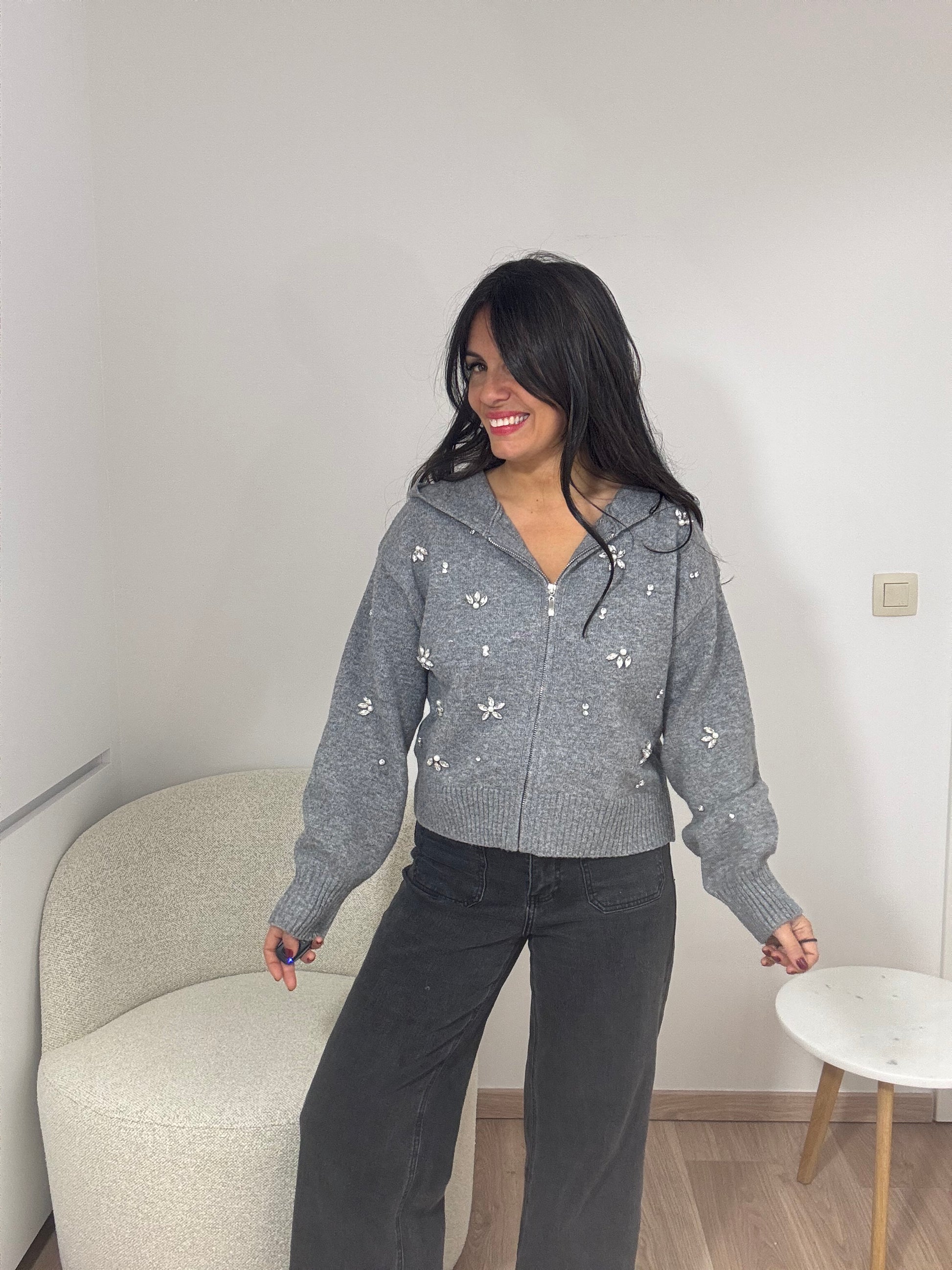 Découvrez le gilet Nixia de la marque Ange, une pièce exceptionnelle qui combine chaleur, style et élégance. Avec sa maille chaude et ses broderies strass et perles, ce gilet zippé à capuche deviendra votre allié préféré pour un look glamour et féminin !