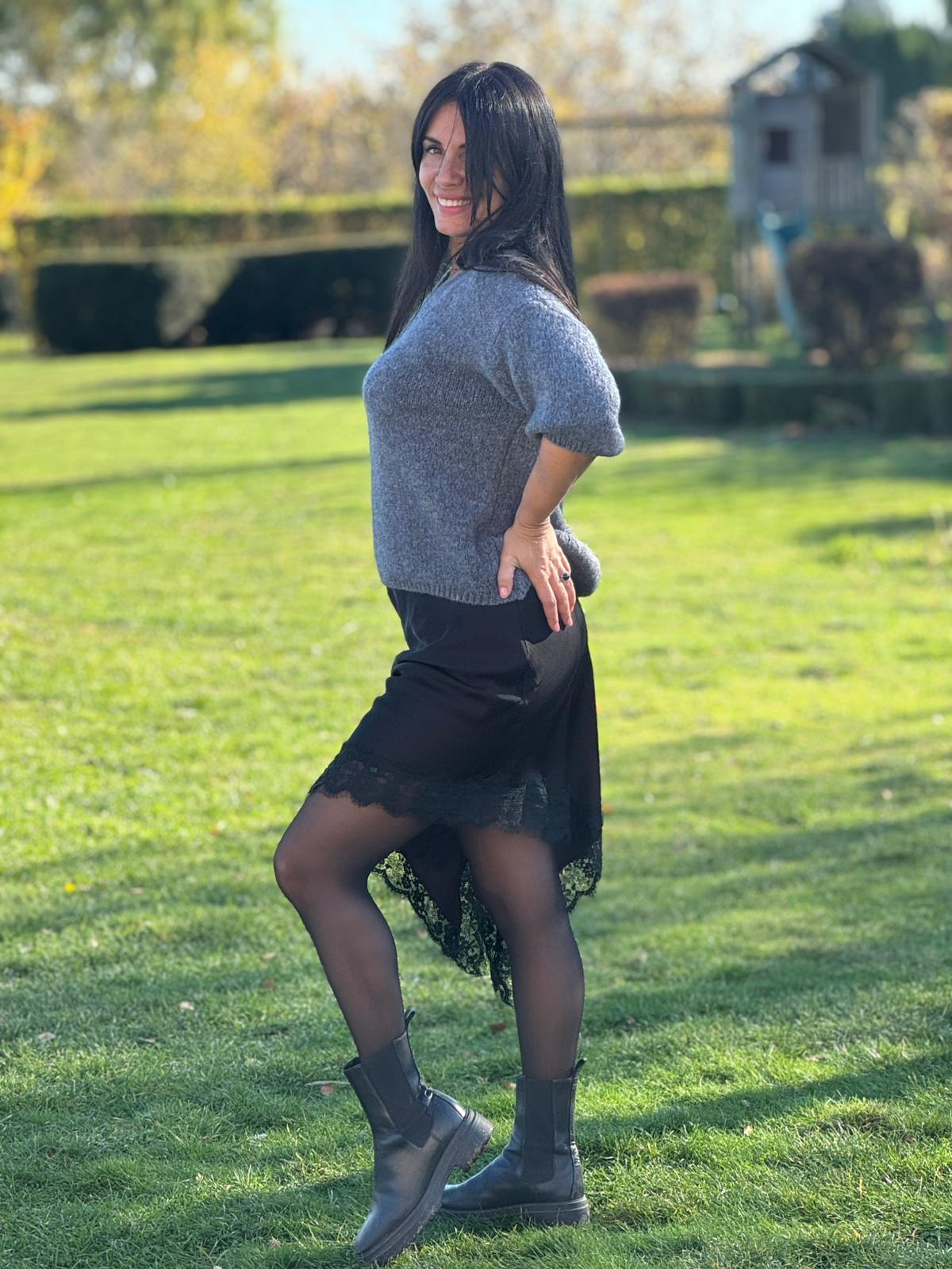 Jupe style satin noir avec détail en dentelle dans le bas asymétrique. Une pièce élégante et sophistiquée qui apporte une touche raffinée à vos tenues.
