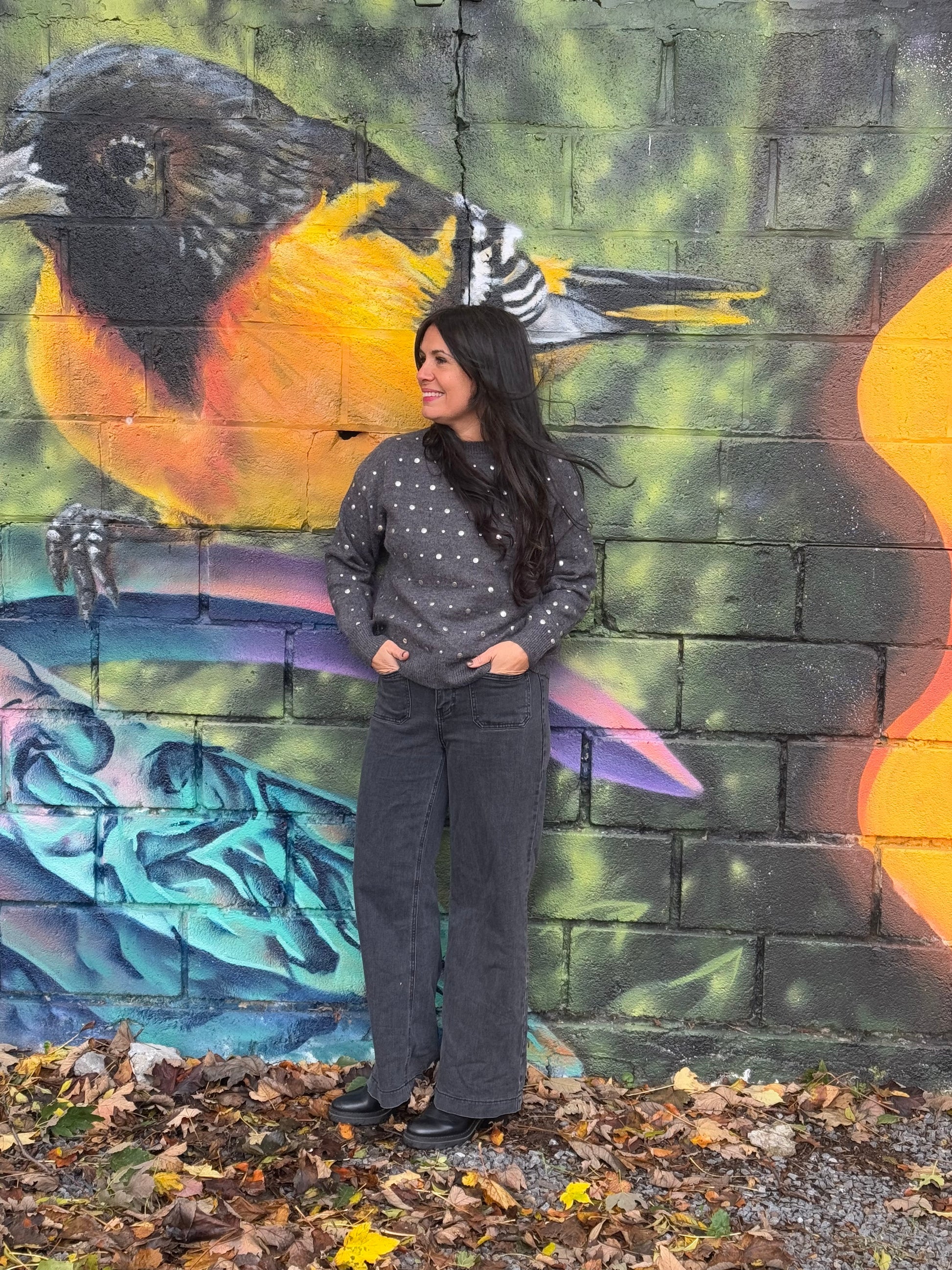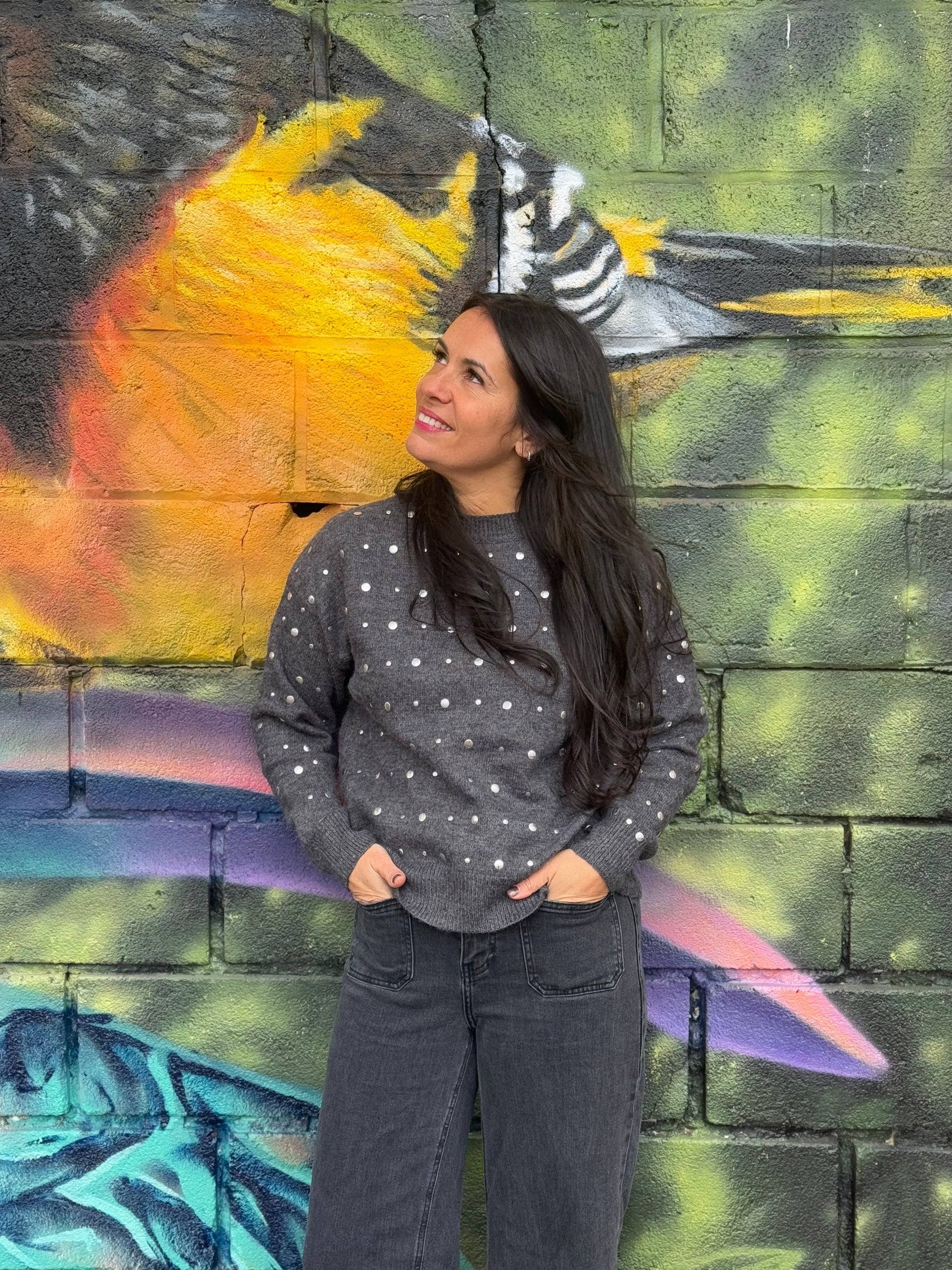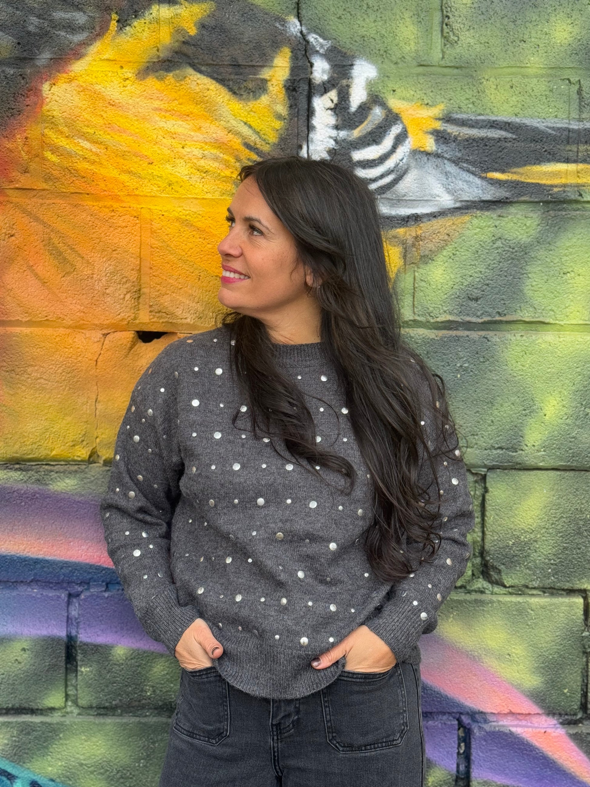 Tombez sous le charme de ce magnifique pull gris anthracite qui allie élégance et douceur. Ses boutons/clous argentés sur le devant apportent une touche sophistiquée et moderne qui fait toute la différence.