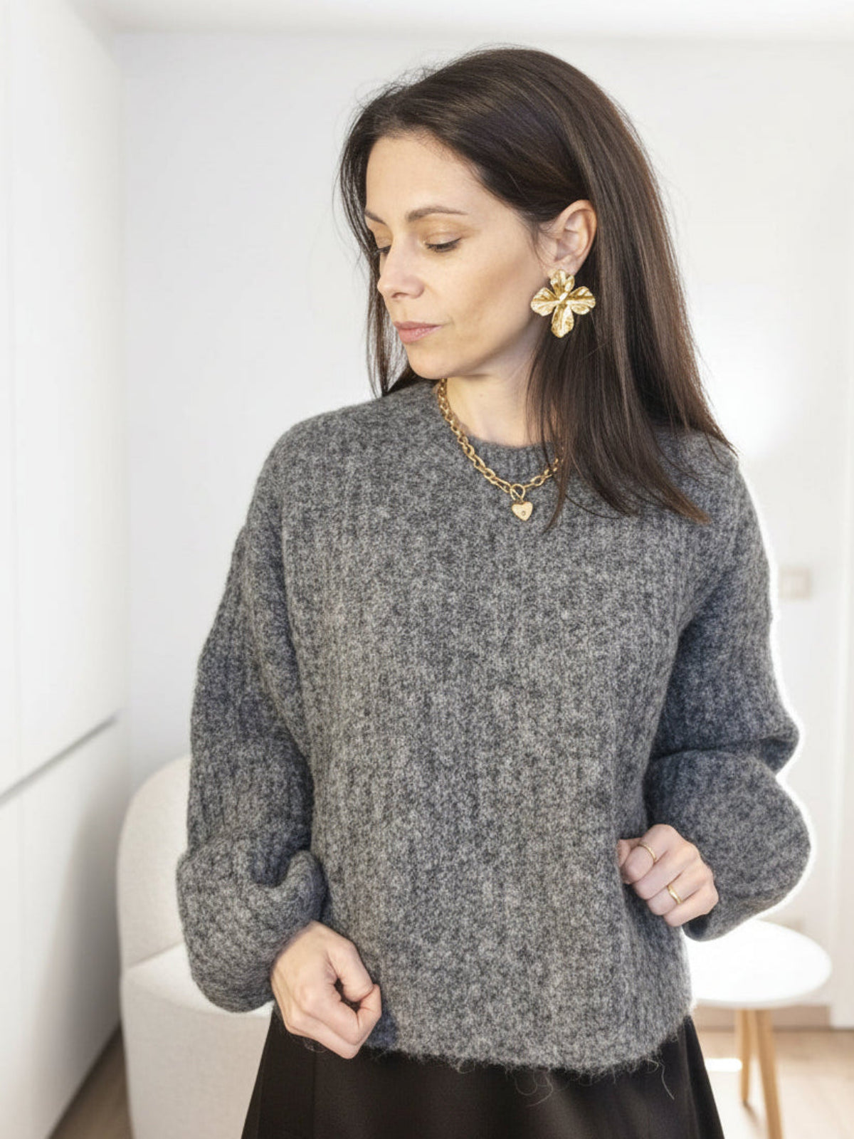 Pull élégant en gris anthracite rehaussé de manches bouffantes pour une touche contemporaine.