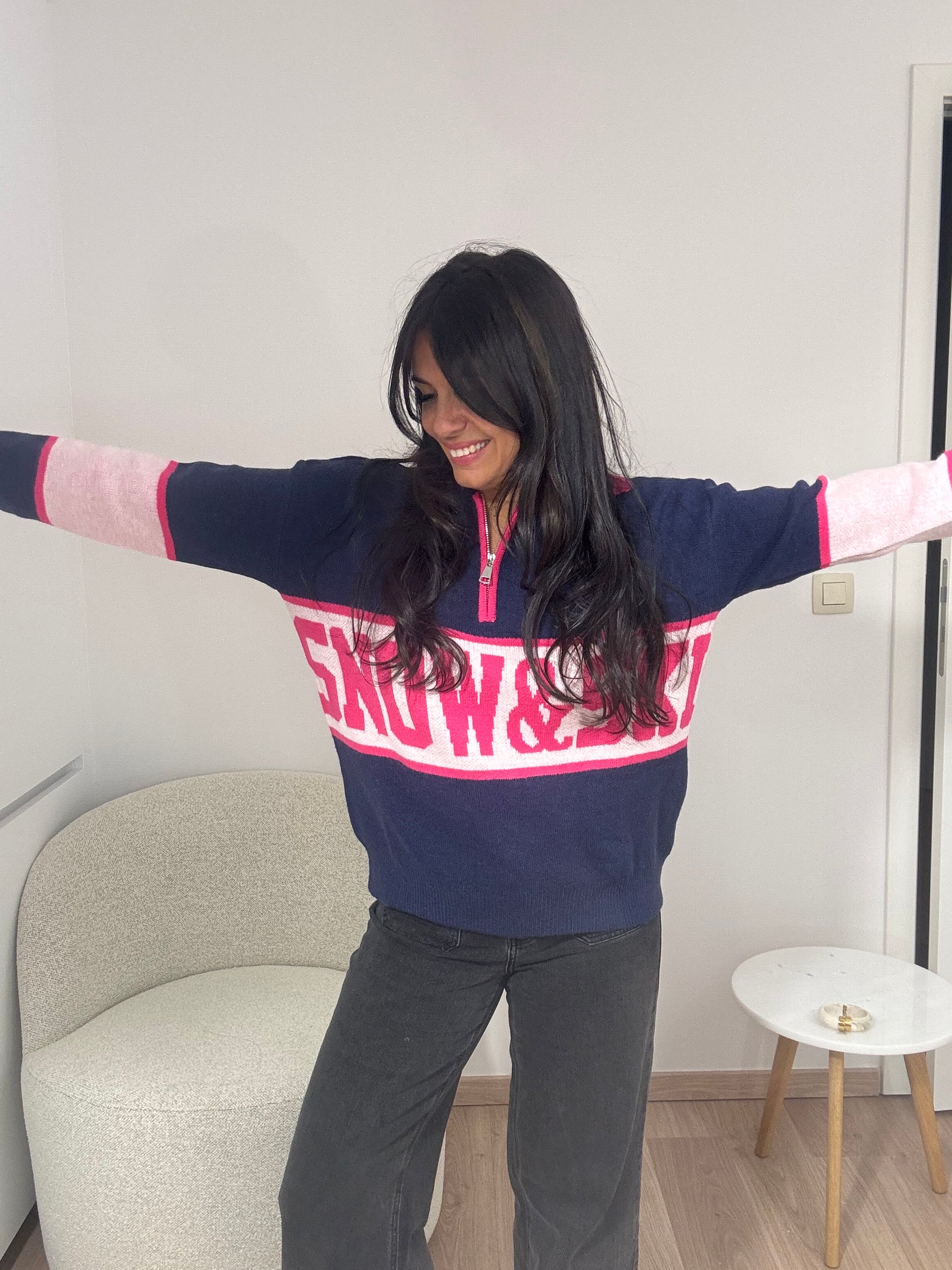 Partez à l'assaut des pistes avec style grâce à ce pull bleu dynamique orné d'une inscription Snow & Ski rose pétillante. Une pièce qui respire l'énergie de la montagne et la joie des sports d'hiver !