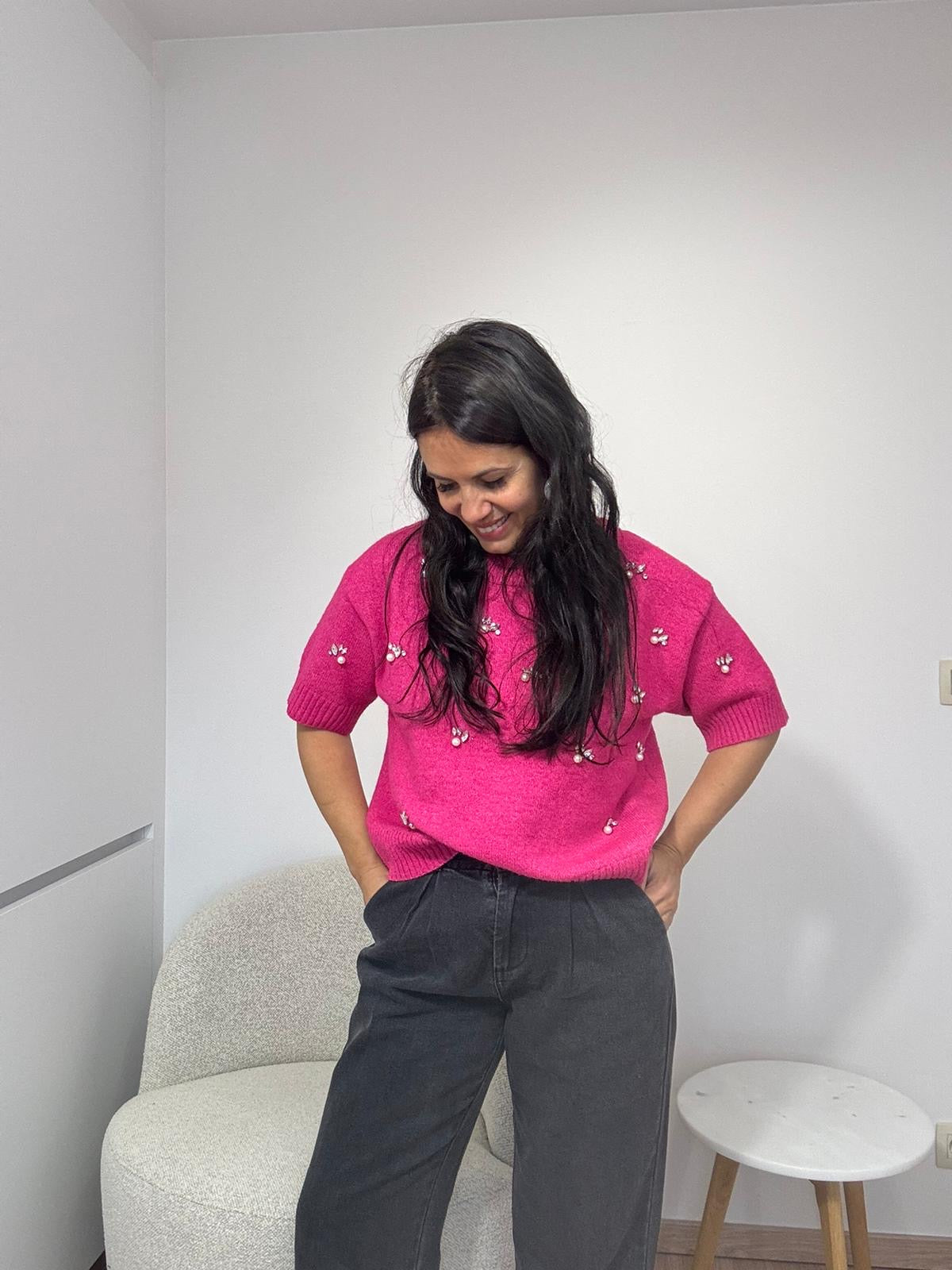 Craquez pour ce magnifique pull Nelida de la marque Ange, couleur fuschia/candy éclatante ! Orné de broderies strass et perles délicates, ce pull manches courtes apporte une touche de glamour et de féminité à vos tenues.