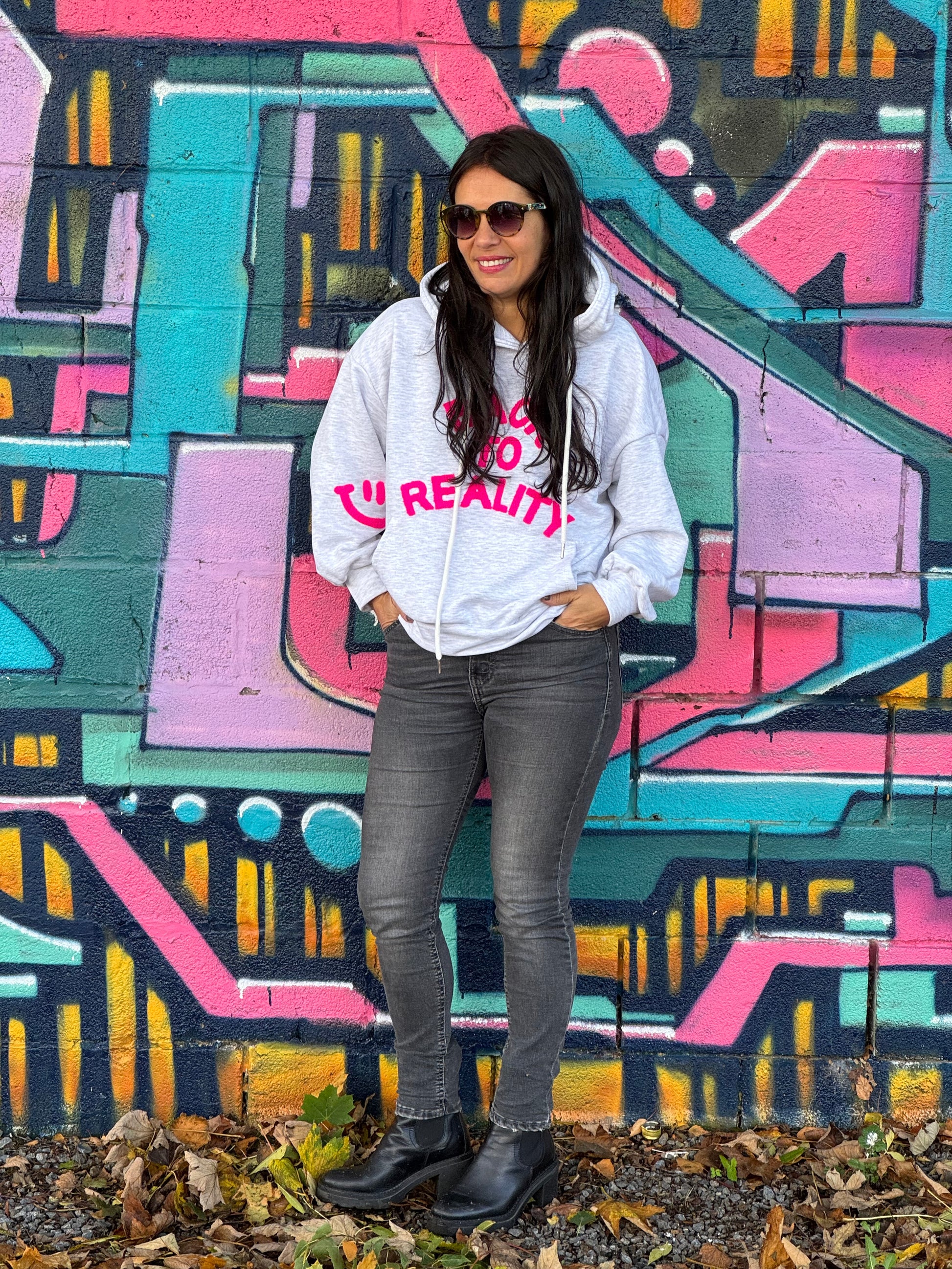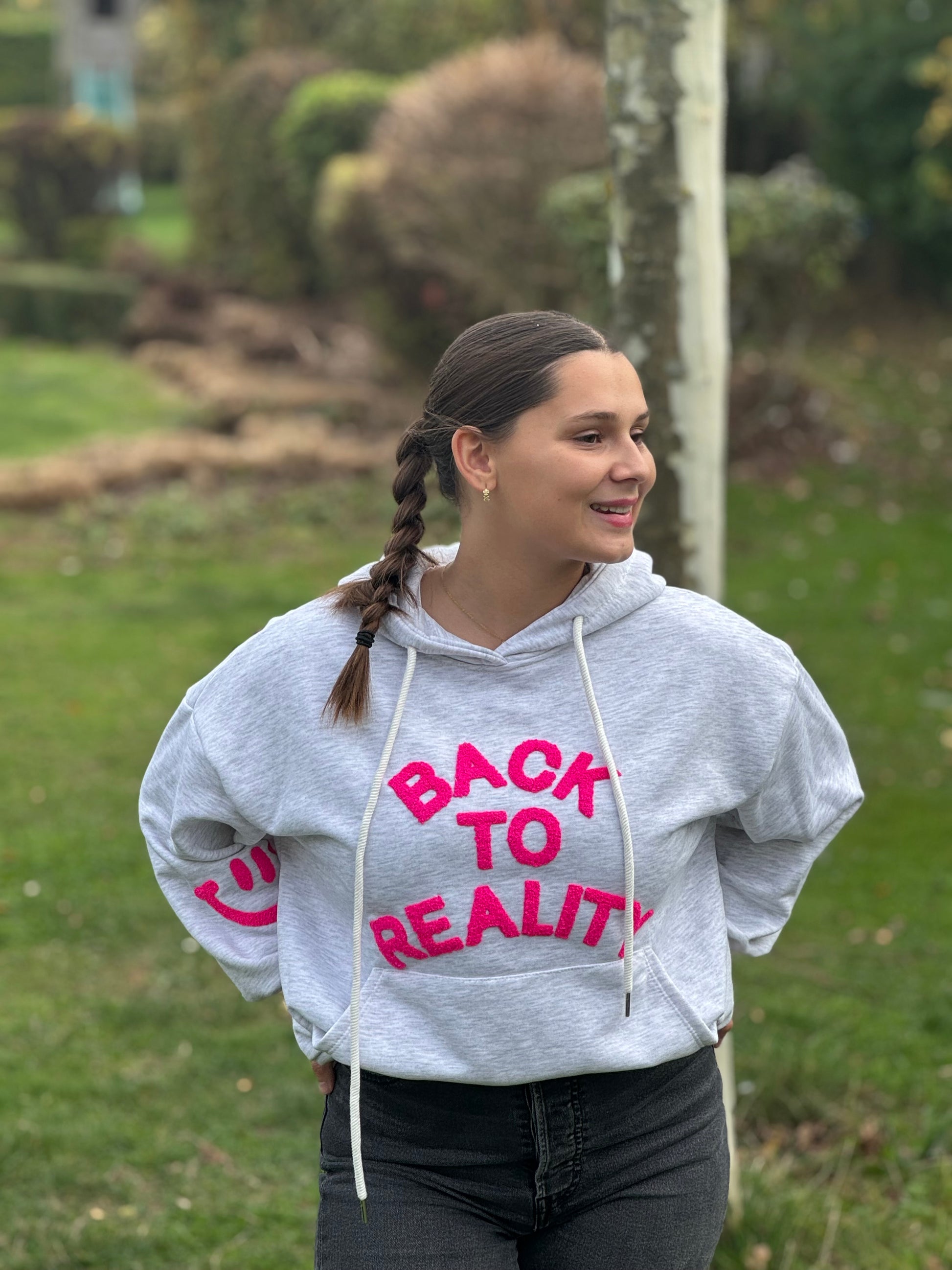 Craquez pour ce sweat gris clair avec son inscription rose "Back to Reality" pleine d'humour ! Orné d'un smiley rose sur la manche droite, ce sweat taille unique allie confort et style décontracté avec une touche de fantaisie.
