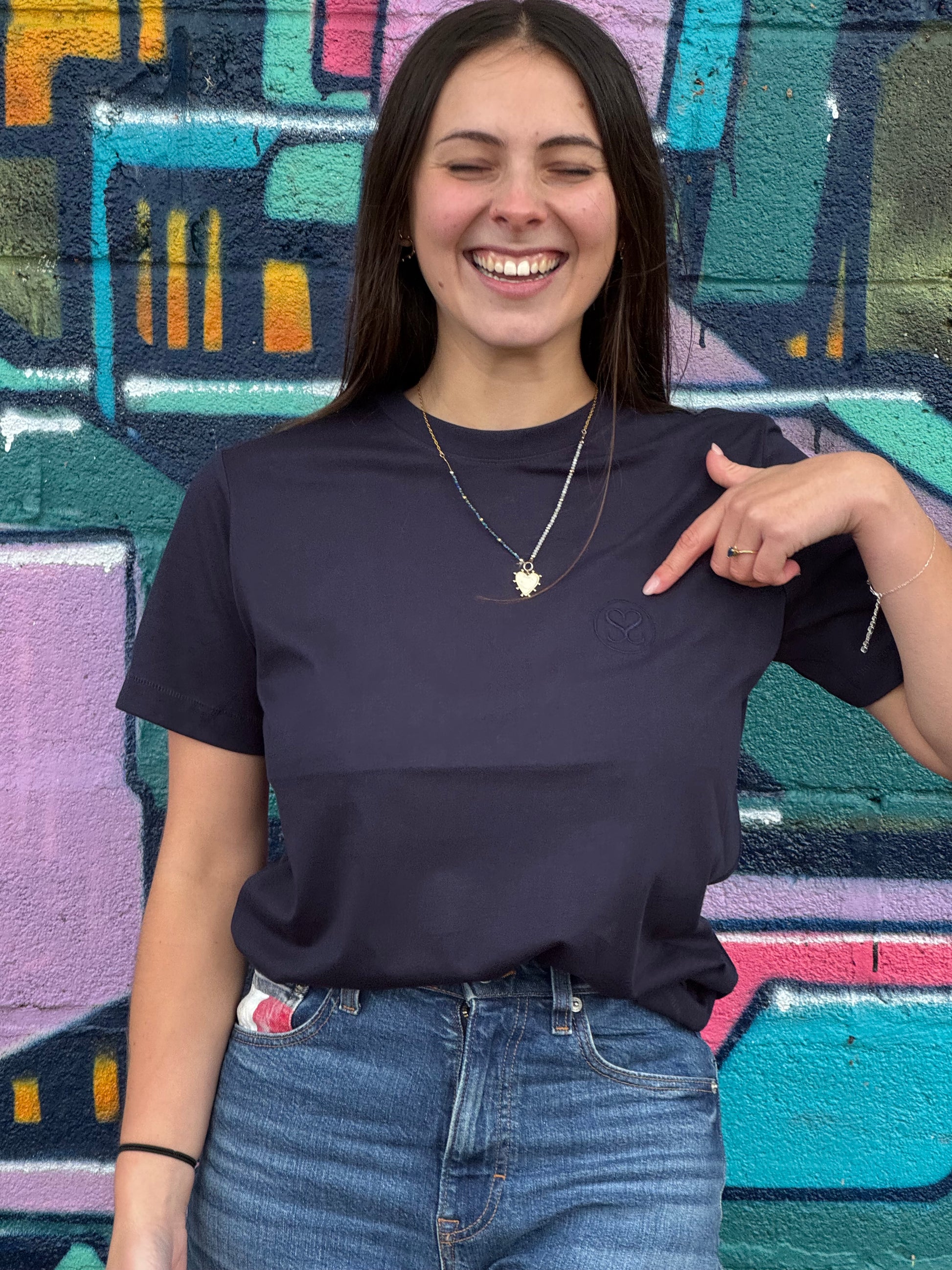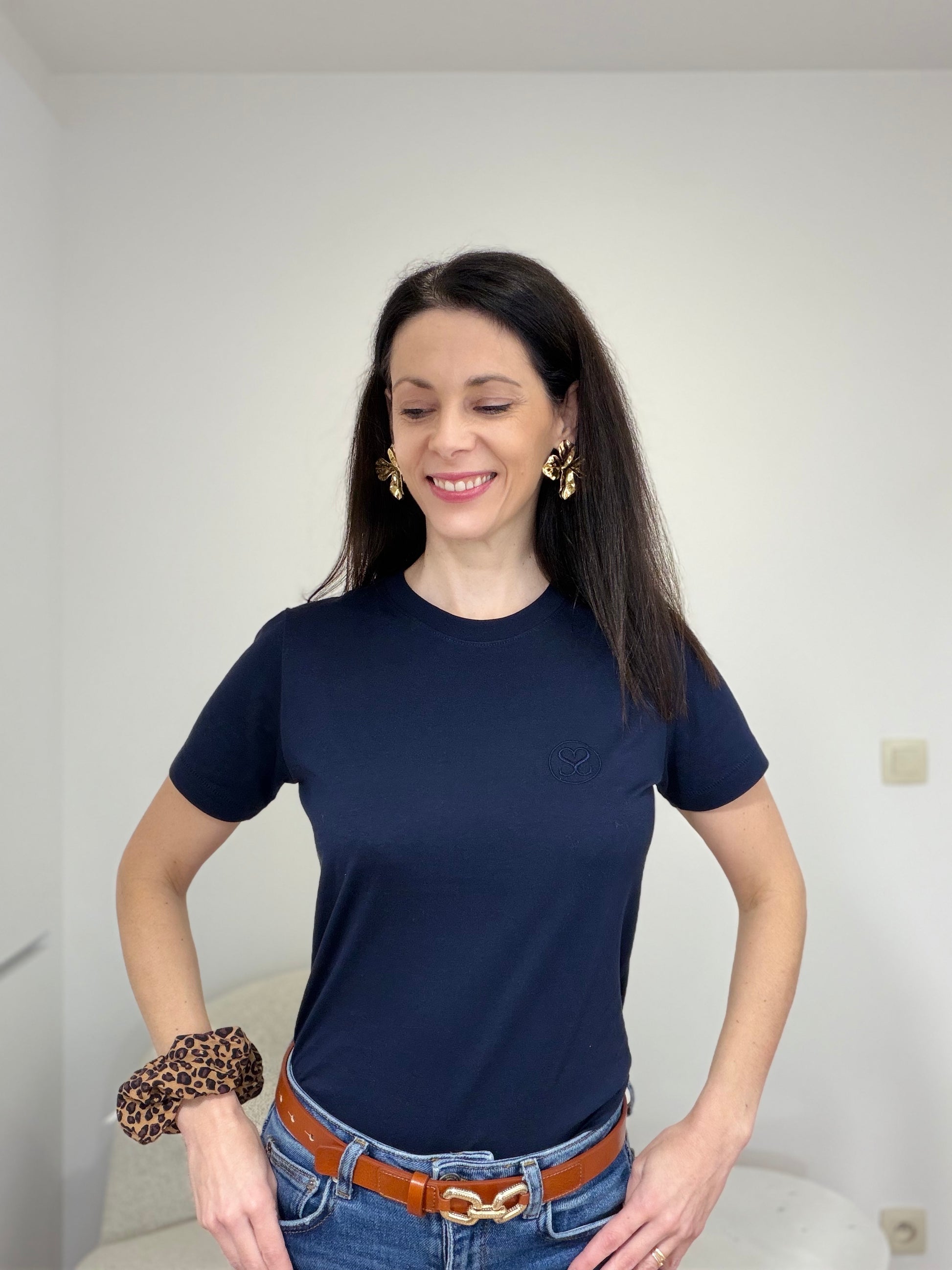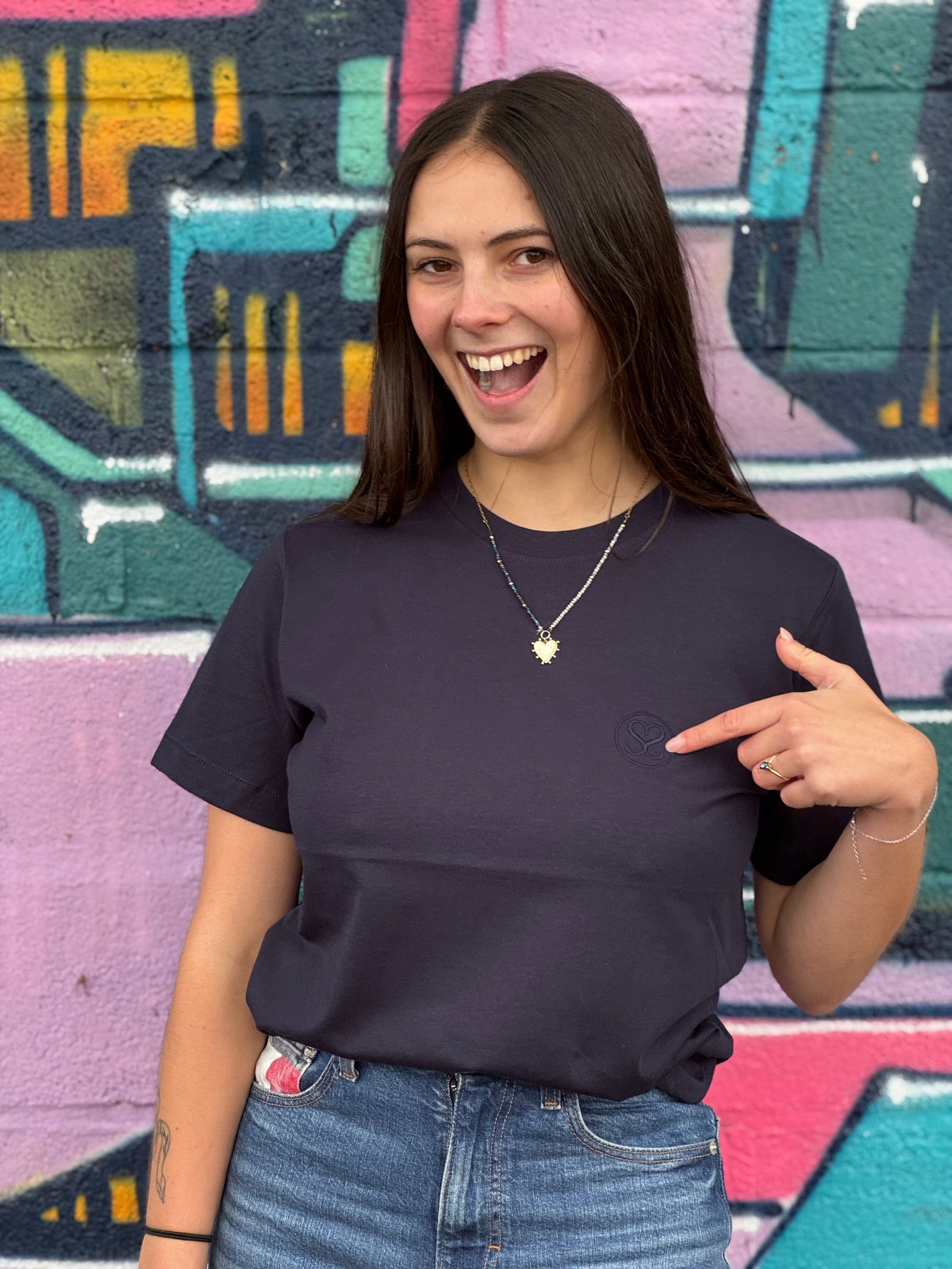 Découvrez notre t-shirt à manches courtes bleu marine avec notre logo brodé sur le cœur, la pièce essentielle de votre garde-robe ! Confortable, stylé et écoresponsable, il incarne parfaitement les valeurs de Noli Sisters.
