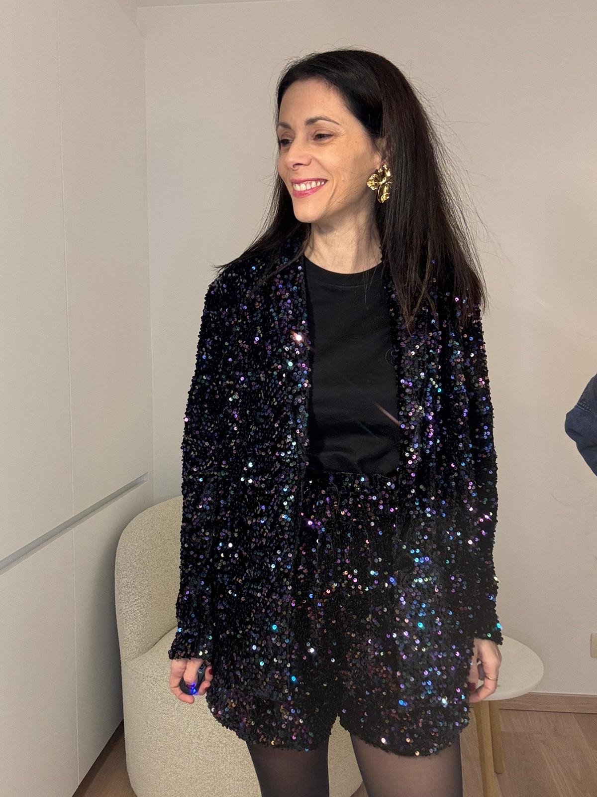 Veste pailletée scintillante qui capte la lumière à chaque mouvement.
